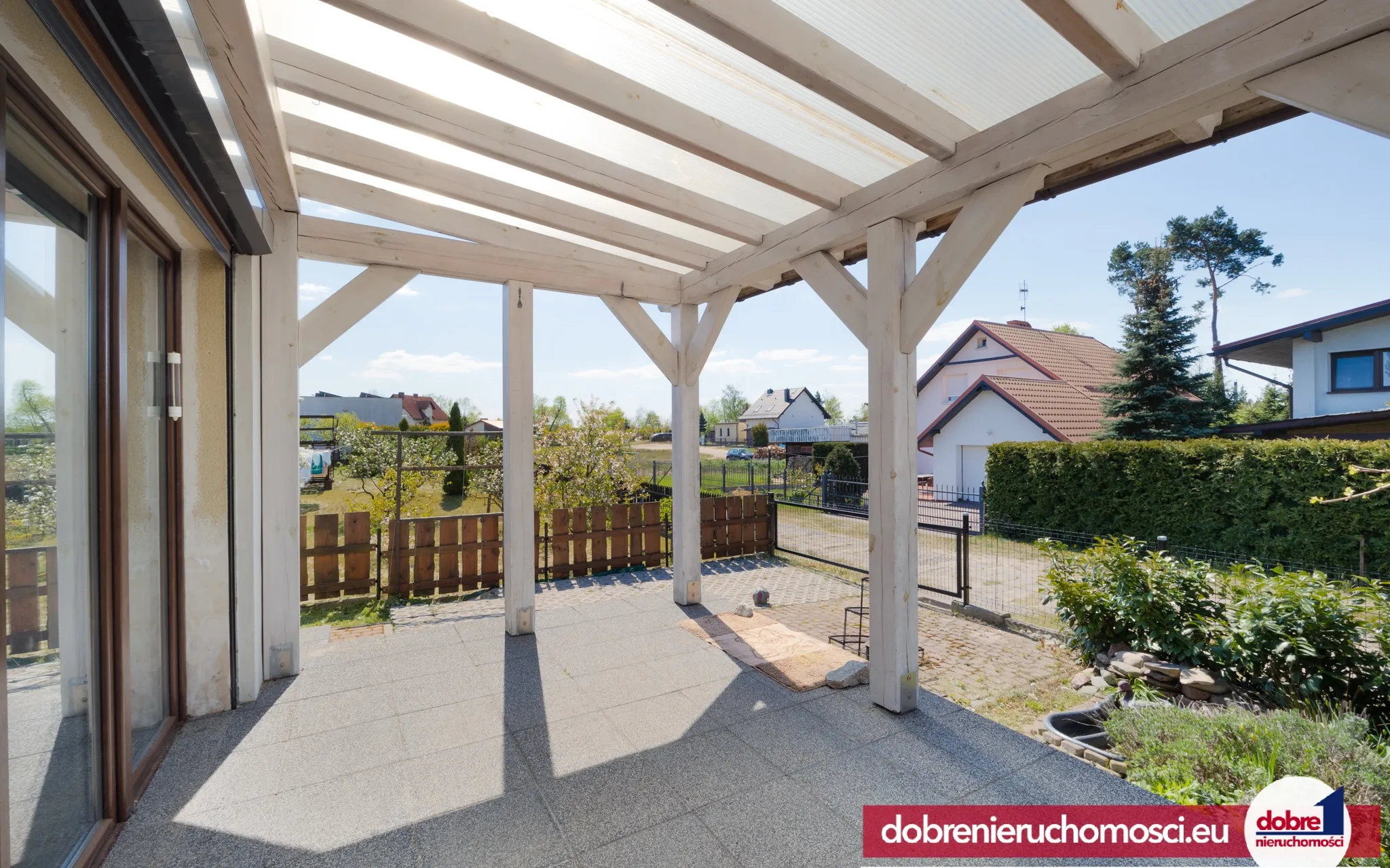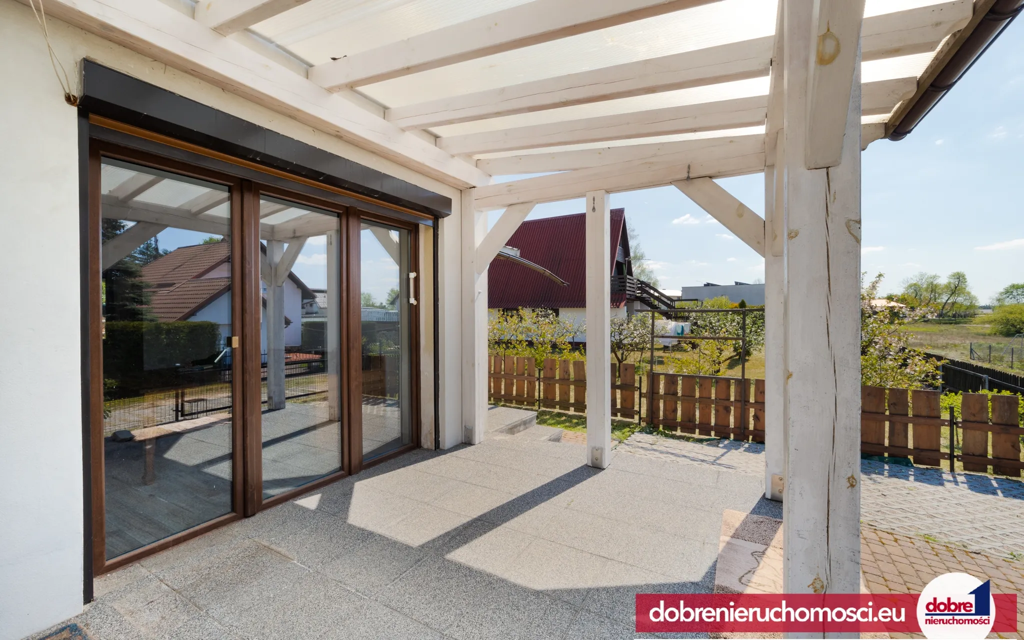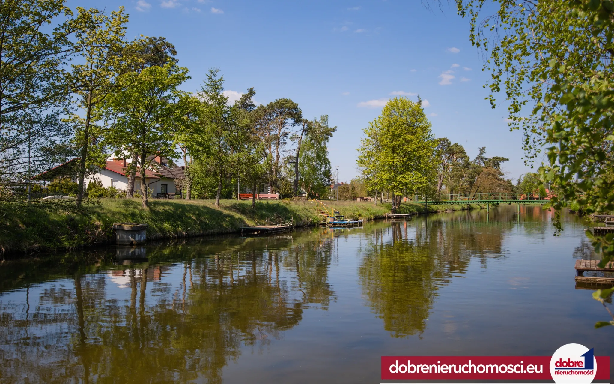 Dom otacza ogrodzona działka o powierzchni około 350 m2, delikatnie opadająca w stronę kanału. Znajdziesz tu również wieloletnie nasadzenia oraz składzik na drewno do kominka. Na posesji znajduje się dwustanowiskowy garaż oraz podjazd, który ułatwia parkowanie. Duży, zadaszony taras wyłożony kaflami antypoślizgowymi jest idealnym miejscem na poranną kawę lub wieczorny odpoczynek.